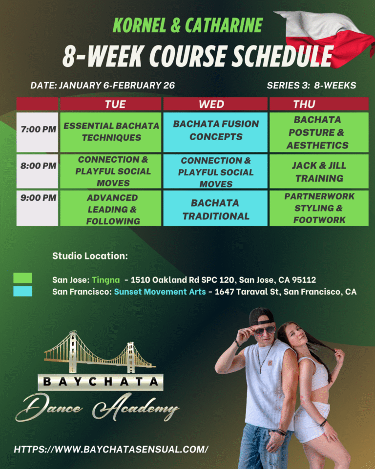 We’re thrilled to welcome Kornel & Catharine, two internationally recognized Bachata Sensual-Fusion instructors from Krakow, Poland, to the Bay Area starting September 2025 for a special 1-year residency at our academy. Known for their appearances at top festivals like Bachata King, Munich Bachata Fest, Bailame, El Sol, Adicto, and events in Australia, they bring world-class experience and a deep passion for teaching. Their classes are open to all levels—from beginners to advanced dancers, instructors, and performers—and they are beloved not only for their talent, but also for their genuine care and dedication to student growth.